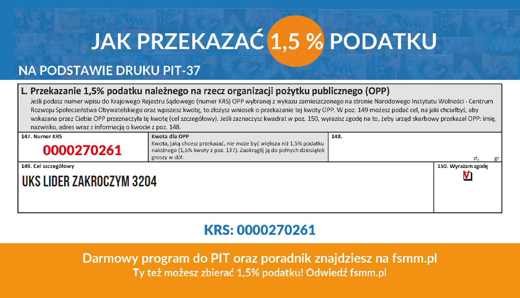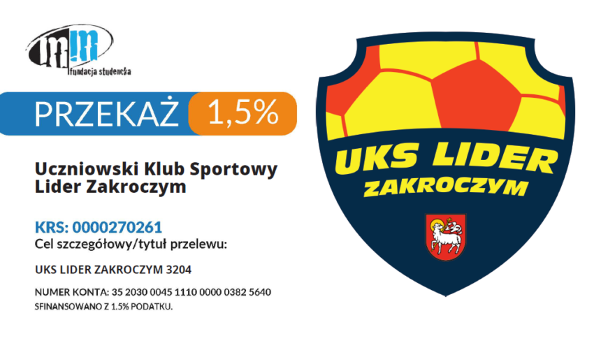 Po raz kolejny mamy szansę wspólnie wesprzeć rozwój młodych talentów! Przekazując 1,5% swojego podatku na UKS Lider Zakroczym, pomagacie nam tworzyć lepsze warunki dla naszych zawodników. Dzięki Waszemu wsparciu dzieci i młodzież mogą realizować swoje sportowe pasje, rozwijać umiejętności i czerpać radość z aktywności fizycznej.